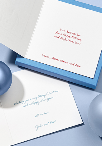 Feiern Sie die Weihnachtszeit mit einer individuell gestalteten Weihnachtskarte. Von verspielten Tieren bis hin zu zeitlosen Traditionen – entdecken Sie Designs für alle auf Ihrer Liste. Die Karten sind exquisit auf unserem charakteristischen White Wove-Karton mit silbernen oder goldenen Akzenten graviert und werden in einem mit Seidenpapier ausgekleideten Umschlag geliefert.