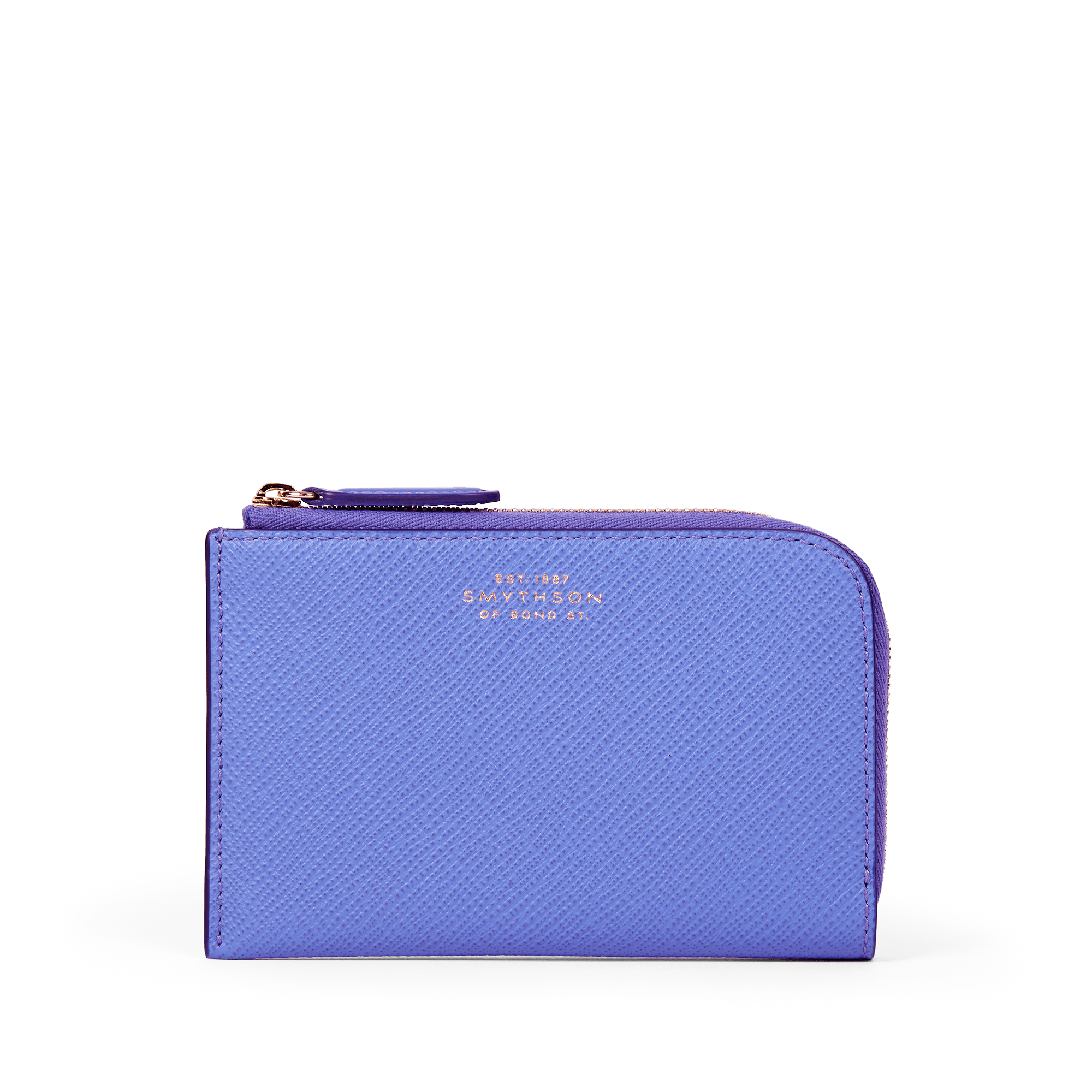 - Kleine flache Tasche aus grob genarbtem Kalbsleder in Ultraviolett, Rundum-Reißverschluss am Hauptfach, glattes Kalbslederfutter